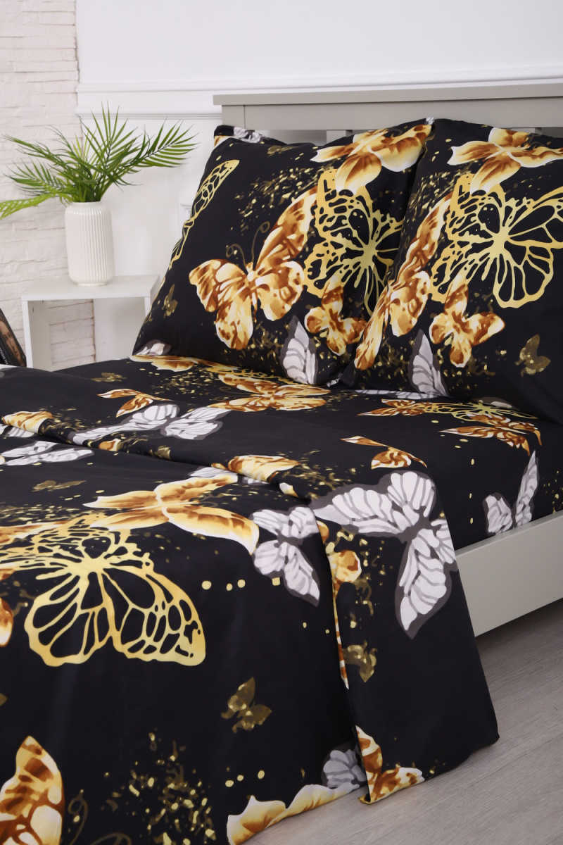 Комплект постельного белья с золотыми бабочками на черном фоне - современный дизайн, создающий уютную свежесть и комфорт в вашей спальне.